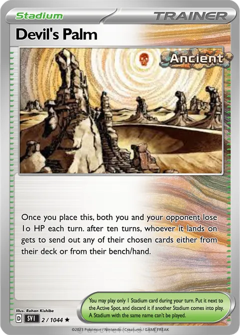 Once you place this, both you and your opponent lose 1o HP each turn. after ten turns, whoever it lands on gets to send out any of their chosen cards either from their deck or from their bench/hand.