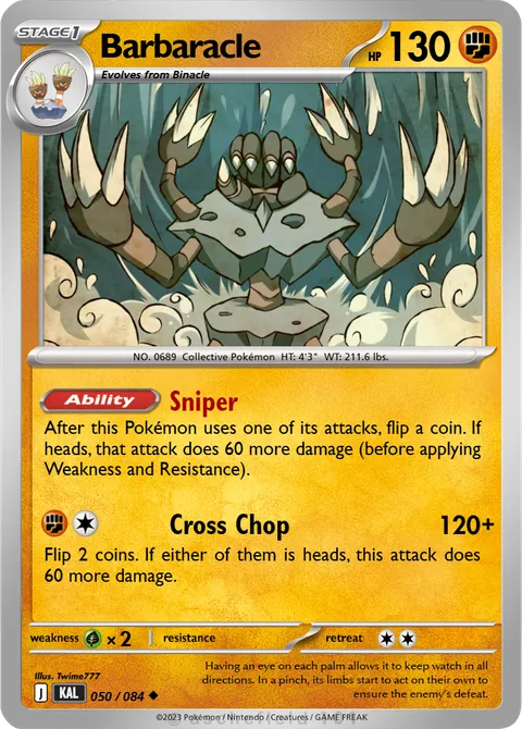 After this Pokémon uses one of its attacks, flip a coin. If heads, that attack does 60 more damage (before applying Weakness and Resistance).Cross Chop • 120+