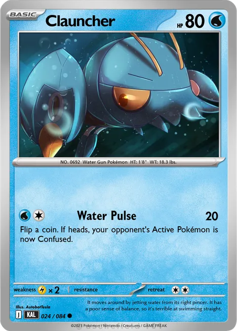 NO. 0692 Water Gun Pokémon HT: 1'8" WT: 18.3 lbs.illus. AutobotTesla#024/084It moves around by jetting water from its right pincer. It has a poor sense of balance, so it’s terrible at swimming straight.Created by @CheesyDonut on 19 September 2025