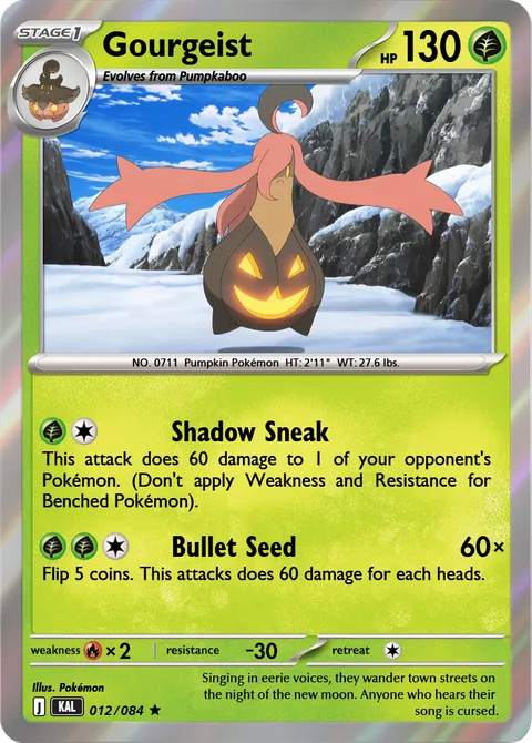 NO. 0711 Pumpkin Pokémon HT: 2'11" WT: 27.6 lbs.illus. Pokémon#012/084Singing in eerie voices, they wander town streets on the night of the new moon. Anyone who hears their song is cursed.Created by @CheesyDonut on 15 September 2025