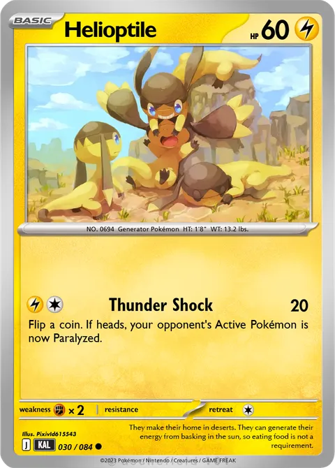 NO. 0694 Generator Pokémon HT: 1'8" WT: 13.2 lbs.illus. PixivId615543#030/084They make their home in deserts. They can generate their energy from basking in the sun, so eating food is not a requirement.Created by @CheesyDonut on 20 September 2025