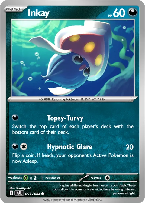 NO. 0686 Revolving Pokémon HT: 1'4" WT: 7.7 lbs.illus. NaokiEguchi#053/084It spins while making its luminescent spots flash. These spots allow it to communicate with others by using different patterns of light.Created by @CheesyDonut on 24 September 2025
