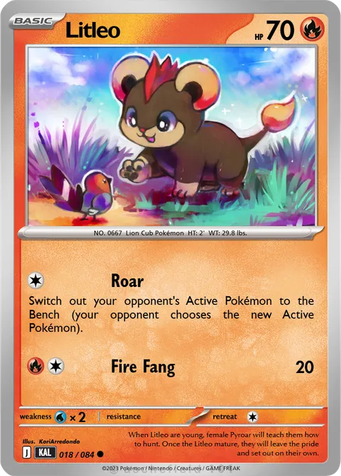 NO. 0667 Lion Cub Pokémon HT: 2' WT: 29.8 lbs.illus. KoriArredondo#018/084When Litleo are young, female Pyroar will teach them how to hunt. Once the Litleo mature, they will leave the pride and set out on their own.Created by @CheesyDonut on 18 September 2025