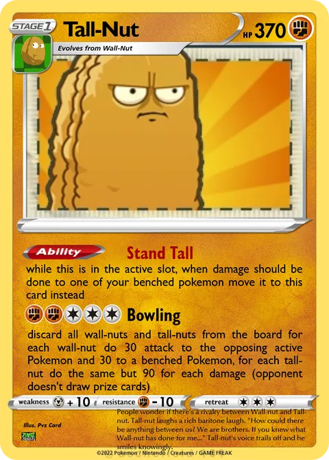 discard all wall-nuts and tall-nuts from the board for each wall-nut do 30 attack to the opposing active Pokemon and 30 to a benched Pokemon, for each tall-nut do the same but 90 for each damage (opponent doesn't draw prize cards)