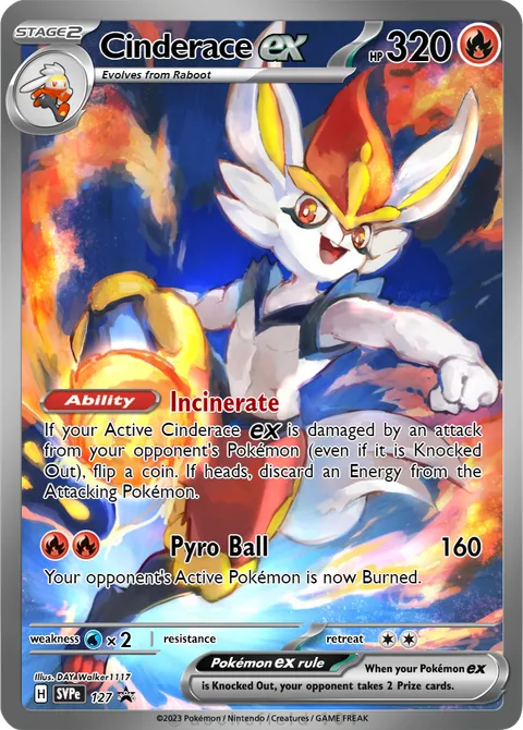 If your Active Cinderace ex is damaged by an attack from your opponent's Pokémon (even if it is Knocked Out), flip a coin. If heads, discard an Energy from the Attacking Pokémon.Pyro Ball • 160