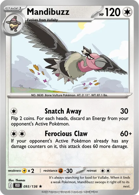 NO. 0630 Bone Vulture Pokémon HT: 3' 11" WT: 87.1 lbs.illus. Thomas#093/136It’s always searching for food for Vullaby. When it finds a weak Pokémon, Mandibuzz swoops it right off to its nest.Created by @Cinderace653 on 17 March 2026, last edited on 17 March 2026Includes assets by Creatures Inc.