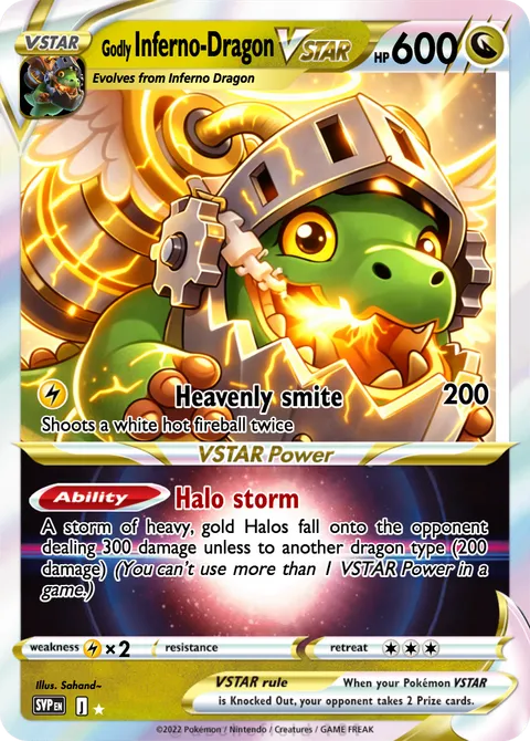 A storm of heavy, gold Halos fall onto the opponent dealing 300 damage unless to another dragon type (200 damage)