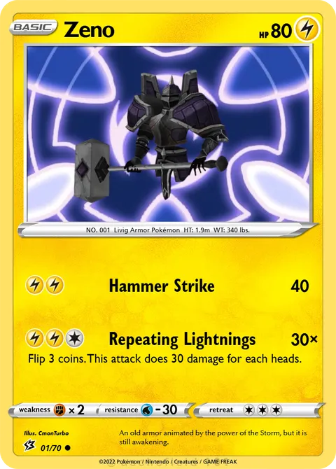 NO. 001 Livig Armor Pokémon HT: 1.9m WT: 340 lbs.illus. CmonTurbo#01/70An old armor animated by the power of the Storm, but it is still awakening.Created by @CmonTurbo on 12 December 2024