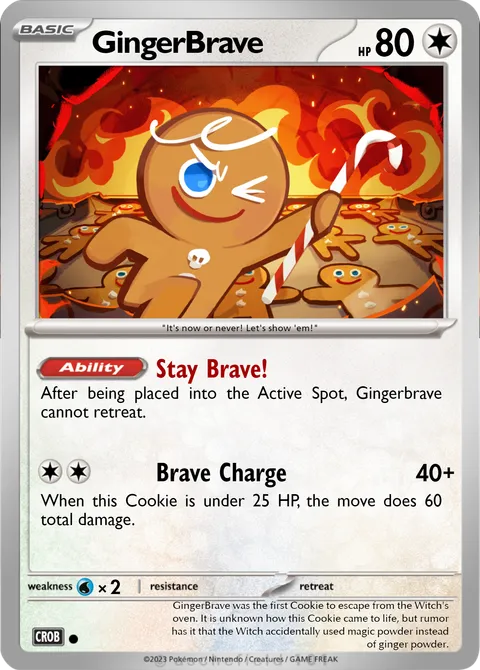 "It's now or never! Let's show 'em!"GingerBrave was the first Cookie to escape from the Witch's oven. It is unknown how this Cookie came to life, but rumor has it that the Witch accidentally used magic powder instead of ginger powder.Created by @CoraCreatingCards on 08 November 2024