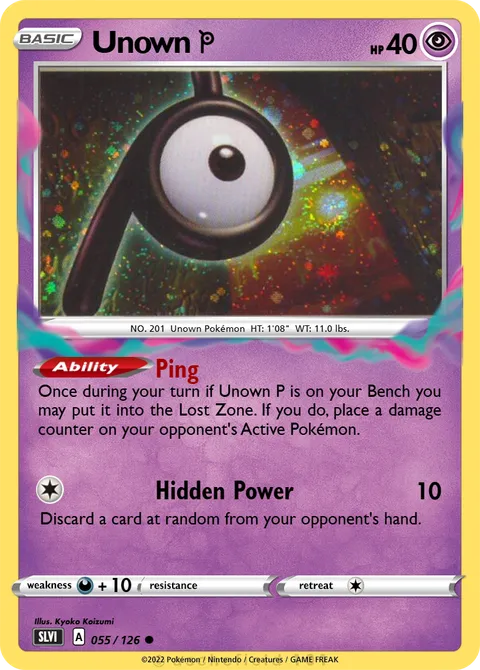 Once during your turn if Unown P is on your Bench you may put it into the Lost Zone. If you do, place a damage counter on your opponent's Active Pokémon.Hidden Power • 10
