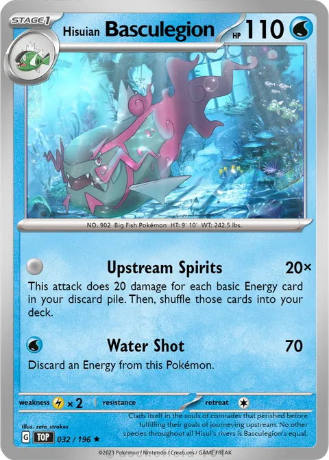 NO. 902 Big Fish Pokémon HT: 9' 10' WT: 242.5 lbs.illus. zeta_strokes#032/196Clads itself in the souls of comrades that perished before fulfilling their goals of journeying upstream. No other species throughout all Hisui's rivers is Basculegion's equal.Created by @Dagatordile on 14 April 2024