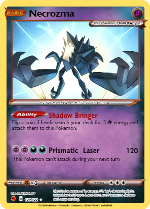 Flip a coin if heads search your deck for 3 P energy and attach them to this Pokemon.Prismatic Laser • 120