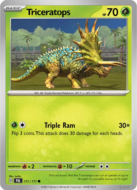 NO. 40 Triple Horned Pokémon HT: 7' + WT: ???.? lbs.illus. Ludia#???/???Did you know that the Triceratops can run at speeds of up to 10 mph? A crocodile moves at 11 mph!Created by @Darthren2603 on 03 July 2023