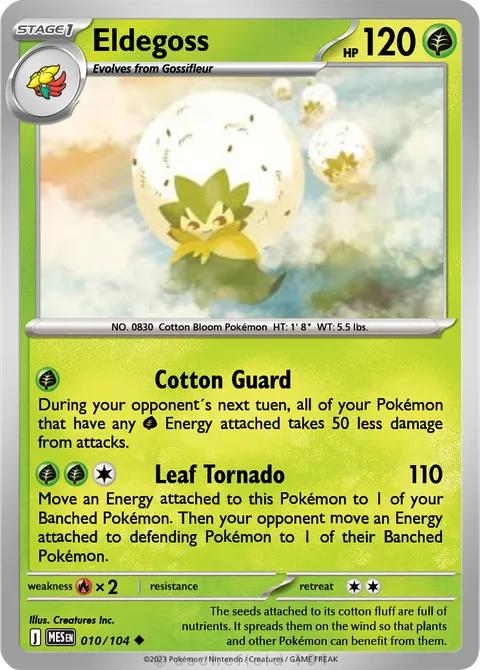 NO. 0830 Cotton Bloom Pokémon HT: 1' 8" WT: 5.5 lbs.illus. Creatures Inc.#010/104The seeds attached to its cotton fluff are full of nutrients. It spreads them on the wind so that plants and other Pokémon can benefit from them. Created by @Delafix on 27 February 2026Includes assets by Creatures Inc.