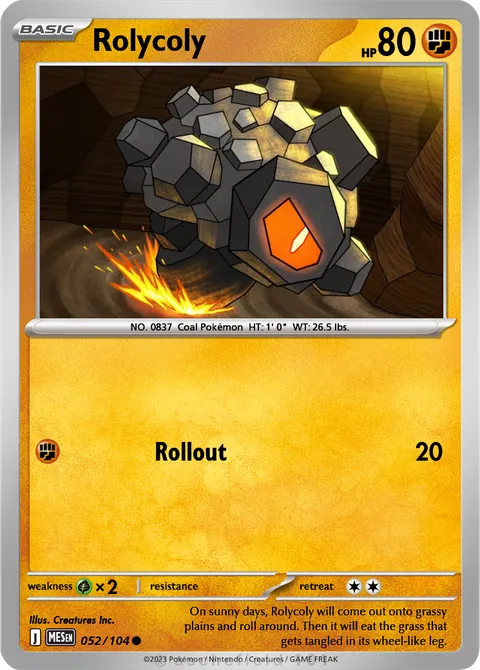 NO. 0837 Coal Pokémon HT: 1' 0" WT: 26.5 lbs.illus. Creatures Inc.#052/104On sunny days, Rolycoly will come out onto grassy plains and roll around. Then it will eat the grass that gets tangled in its wheel-like leg. Created by @Delafix on 16 March 2026