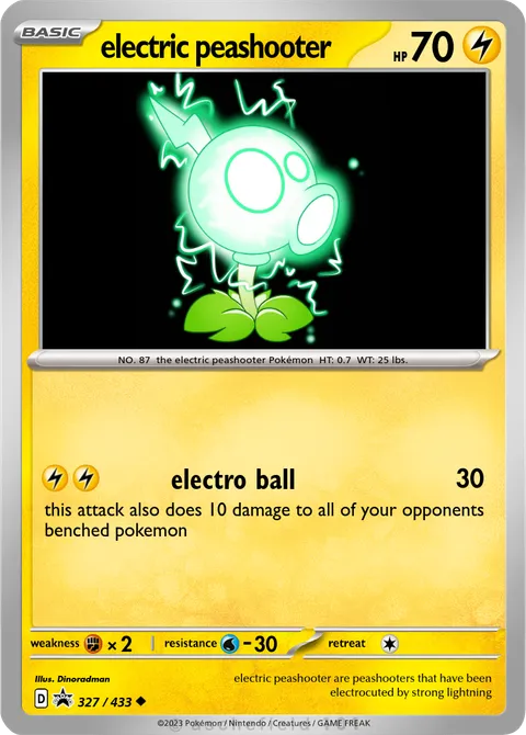NO. 87 the electric peashooter Pokémon HT: 0.7 WT: 25 lbs.illus. Dinoradman#327/433electric peashooter are peashooters that have been electrocuted by strong lightningCreated by @Dinoradman on 12 April 2024