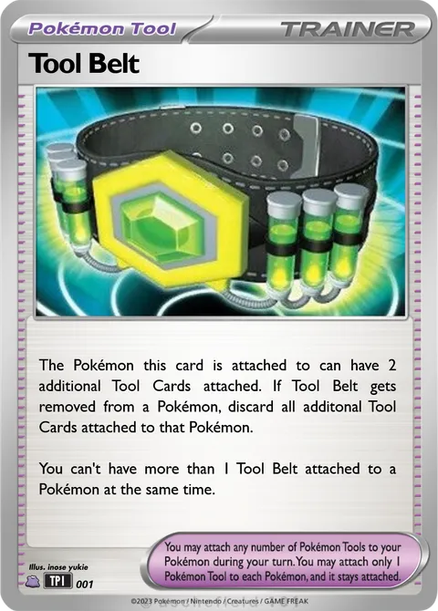The Pokémon this card is attached to can have 2 additional Tool Cards attached. If Tool Belt gets removed from a Pokémon, discard all additonal Tool Cards attached to that Pokémon. You can't have more than 1 Tool Belt attached to a Pokémon at the same time.