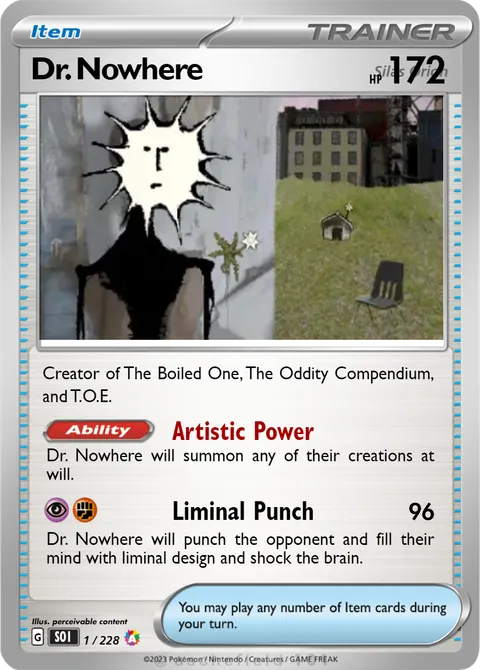 Dr. Nowhere will punch the opponent and fill their mind with liminal design and shock the brain.
