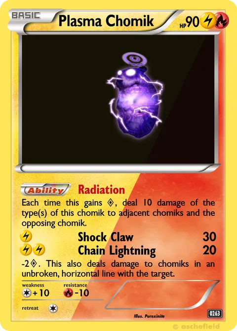 Each time this gains p, deal 10 damage of the type(s) of this chomik to adjacent chomiks and the opposing chomik.Shock Claw • 30