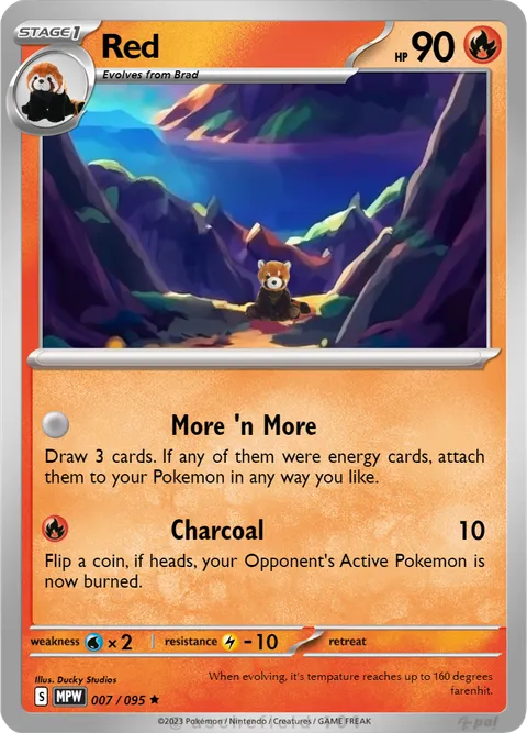 Draw 3 cards. If any of them were energy cards, attach them to your Pokemon in any way you like. Flip a coin, if heads, your Opponent's Active Pokemon is now burned. illus. Ducky Studios#007/095When evolving, it's tempature reaches up to 160 degrees farenhit.