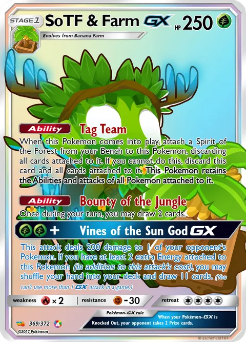 When this Pokemon comes into play, attach a Spirit of the Forest from your Bench to this Pokemon, discarding all cards attached to it. If you cannot do this, discard this card and all cards attached to it. This Pokemon retains the Abilities and attacks of all Pokemon attached to it.Ability: Bounty of the Jungle