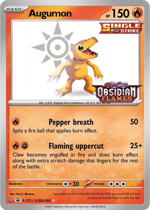 NO. 9,375 Digital Dino Pokémon HT: 4'7 WT: 80 lbs.illus. Eric D. Monkey#9,375/3,000,000Agumon is a very friendly but fiesty little guy and will protect anyone he holds dear to with his life.Created by @EricDMonkey on 16 March 2024