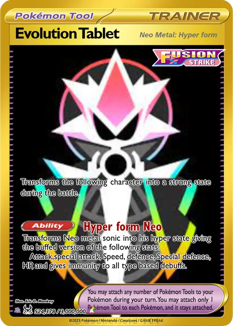 Transforms Neo metal sonic into his hyper state giving the buffed version of the following stats: Attack,special attack, Speed, defence, Special defence, HP, and gives immunity to all type based debuffs.Created by @EricDMonkey on 13 March 2024