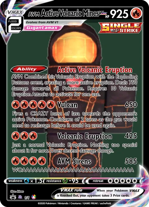 AVM Combined his Volcanic Eruption with the Exploding Buttons event, creating a more active eruption. Deals 750 damage towards all Pokemon. Requires 10 Volcanic Eruption Attacks to activate for one use.Vulcan • 650