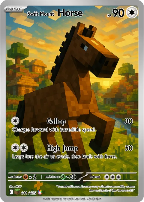illus. FRZY#011/025“Tamed with care, horses carry adventurers swiftly across the vast lands of the Overworld.”Created by @FRZK on 29 August 2025Includes assets by Creatures Inc.