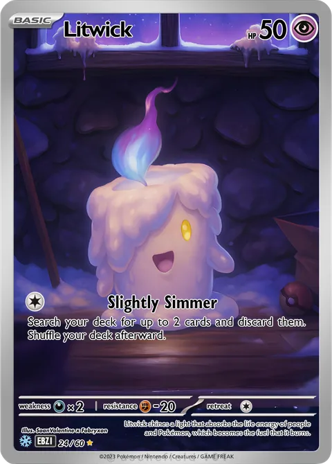 illus. SoanValentine x Fabryxon#24/60Litwick shines a light that absorbs the life energy of people and Pokémon, which becomes the fuel that it burns.Created by @FaBRyXoN99 on 14 June 2025Includes assets by Creatures Inc.