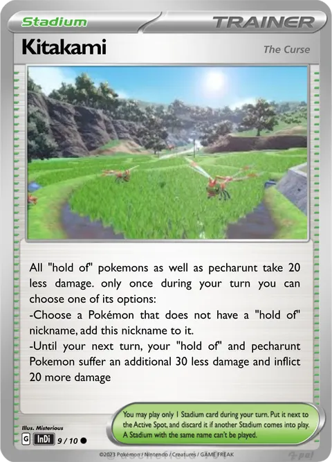All "hold of" pokemons as well as pecharunt take 20 less damage. only once during your turn you can choose one of its options: -Choose a Pokémon that does not have a "hold of" nickname, add this nickname to it. -Until your next turn, your "hold of" and pecharunt Pokemon suffer an additional 30 less damage and inflict 20 more damage