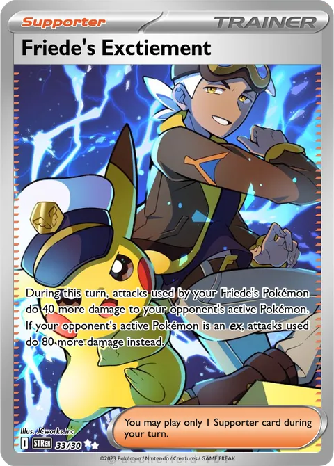 During this turn, attacks used by your Friede's Pokémon do 40 more damage to your opponent's active Pokémon. If your opponent's active Pokémon is an ex, attacks used do 80 more damage instead.