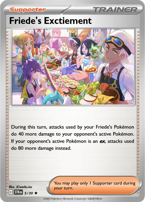 During this turn, attacks used by your Friede's Pokémon do 40 more damage to your opponent's active Pokémon. If your opponent's active Pokémon is an ex, attacks used do 80 more damage instead.