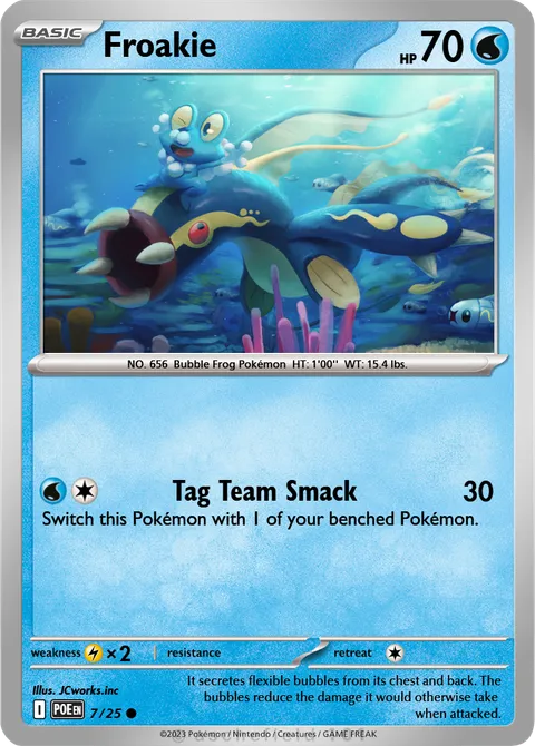 NO. 656 Bubble Frog Pokémon HT: 1'00'' WT: 15.4 lbs.illus. JCworks.inc#7/25It secretes flexible bubbles from its chest and back. The bubbles reduce the damage it would otherwise take when attacked.Created by @FrankoTheCat on 31 December 2025