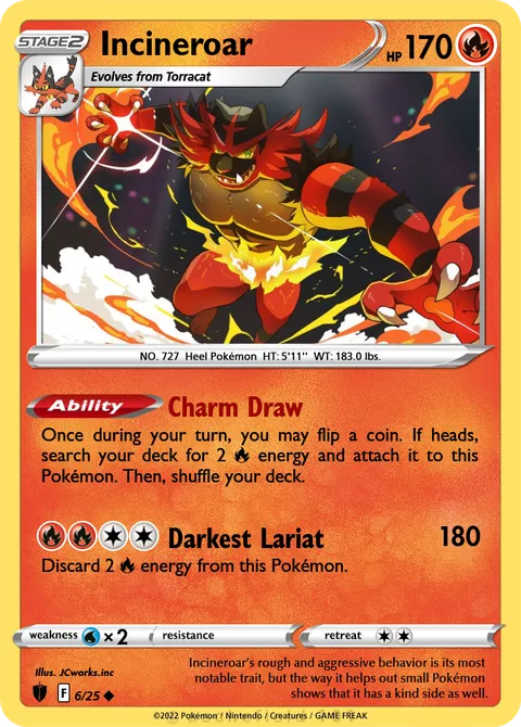 Once during your turn, you may flip a coin. If heads, search your deck for 2 R energy and attach it to this Pokémon. Then, shuffle your deck.Darkest Lariat • 180