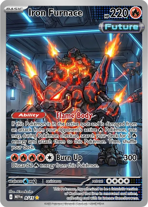 If this Pokémon is in the active spot and is damaged from an attack from your opponent's active R Pokémon, you may, during Pokémon checkup, search your deck for 2 R energy and attach them to this Pokémon. Then, shuffle your deck.Burn Up • 300