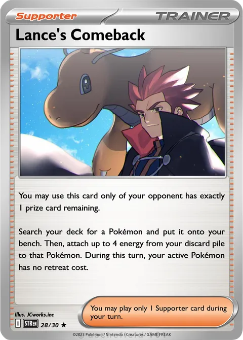 You may use this card only of your opponent has exactly 1 prize card remaining. Search your deck for a Pokémon and put it onto your bench. Then, attach up to 4 energy from your discard pile to that Pokémon. During this turn, your active Pokémon has no retreat cost.