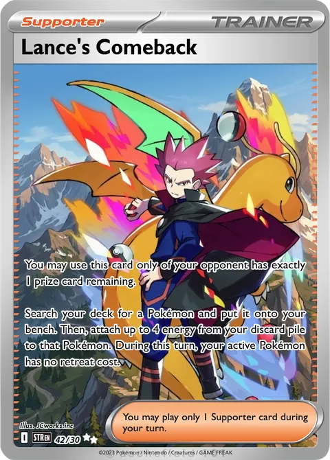 You may use this card only of your opponent has exactly 1 prize card remaining. Search your deck for a Pokémon and put it onto your bench. Then, attach up to 4 energy from your discard pile to that Pokémon. During this turn, your active Pokémon has no retreat cost.