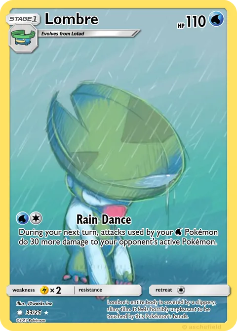 illus. JCworks.inc#33/25Lombre’s entire body is covered by a slippery, slimy film. It feels horribly unpleasant to be touched by this Pokémon’s hands.Created by @FrankoTheCat on 22 December 2025
