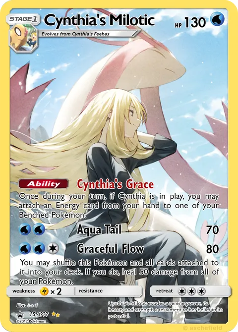 Once during your turn, if Cynthia is in play, you may attach an Energy card from your hand to one of your Benched Pokémon.Aqua Tail • 70