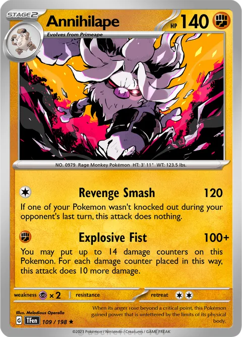 NO. 0979 Rage Monkey Pokémon HT: 3' 11" WT: 123.5 lbs.illus. Melodious Operella#109/198When its anger rose beyond a critical point, this Pokémon gained power that is unfettered by the limits of its physical body.Created by @Garchamp57 on 30 May 2025
