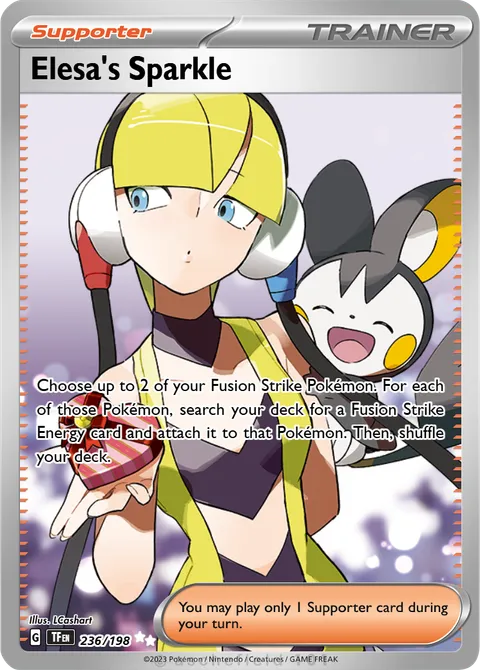 Choose up to 2 of your Fusion Strike Pokémon. For each of those Pokémon, search your deck for a Fusion Strike Energy card and attach it to that Pokémon. Then, shuffle your deck.