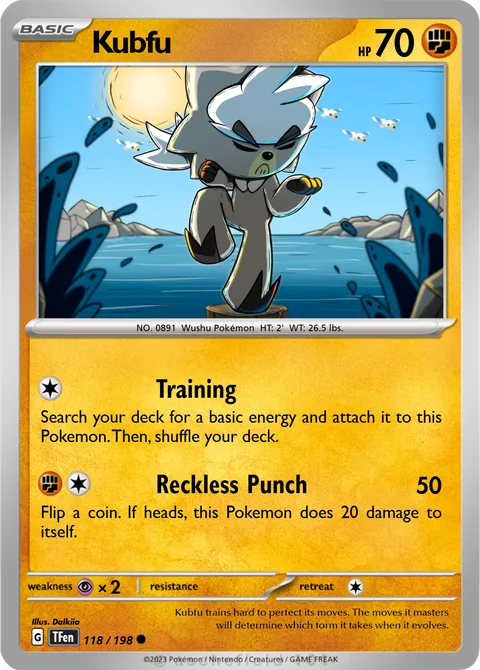 NO. 0891 Wushu Pokémon HT: 2' WT: 26.5 lbs.illus. Dalkiia#118/198Kubfu trains hard to perfect its moves. The moves it masters will determine which form it takes when it evolves.Created by @Garchamp57 on 01 June 2025