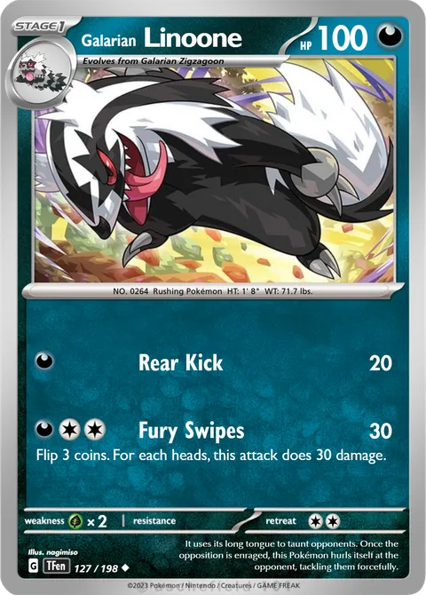 NO. 0264 Rushing Pokémon HT: 1' 8" WT: 71.7 lbs.illus. nagimiso#127/198It uses its long tongue to taunt opponents. Once the opposition is enraged, this Pokémon hurls itself at the opponent, tackling them forcefully.Created by @Garchamp57 on 02 June 2025
