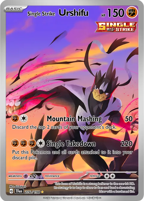illus. LCashart#216/198This form of Urshifu is a strong believer in the one-hit KO. Its strategy is to leap in close to foes and land a devastating blow with a hardened fist.Created by @Garchamp57 on 27 June 2025