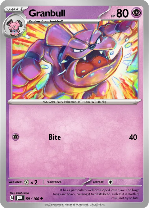 NO. 0210 Fairy Pokémon HT: 1,4m WT: 48,7kgillus. Irischroma#59/100It has a particularly well-developed lower jaw. The huge fangs are heavy, causing it to tilt its head. Unless it is startled, it will not try to bite.Created by @GavinGengar on 04 March 2025