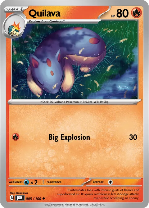 NO. 0156 Volcano Pokémon HT: 0,9m WT: 19,0kgillus. Unknown#005/100It intimidates foes with intense gusts of flames and superheated air. Its quick nimbleness lets it dodge attacks even while scorching an enemy.Created by @GavinGengar on 24 January 2025