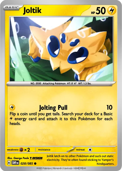 NO. 0595 Attaching Pokémon HT: 0' 4" WT: 1.3 lbs.illus. George Poole **--Y-DESIGN--** #028/085Joltik latch on to other Pokémon and suck out static electricity. They’re often found sticking to Yamper’s hindquarters.Created by @GeorgePoole on 27 February 2026, last edited on 27 February 2026
