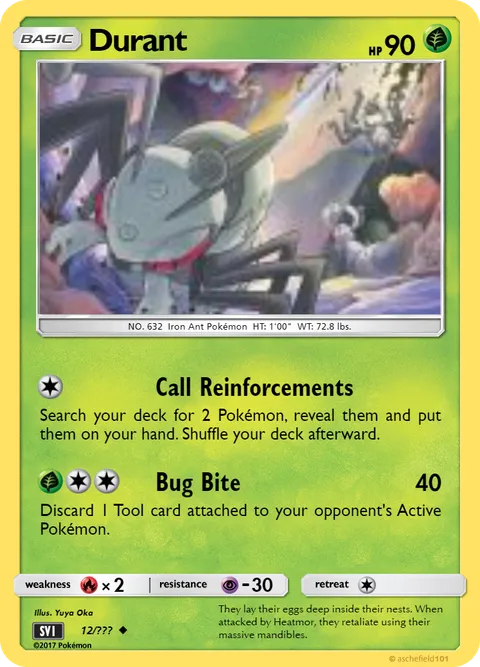 NO. 632 Iron Ant Pokémon HT: 1'00" WT: 72.8 lbs.illus. Yuya Oka#12/??? They lay their eggs deep inside their nests. When attacked by Heatmor, they retaliate using their massive mandibles.Created by @Gholdenbro on 02 January 2024