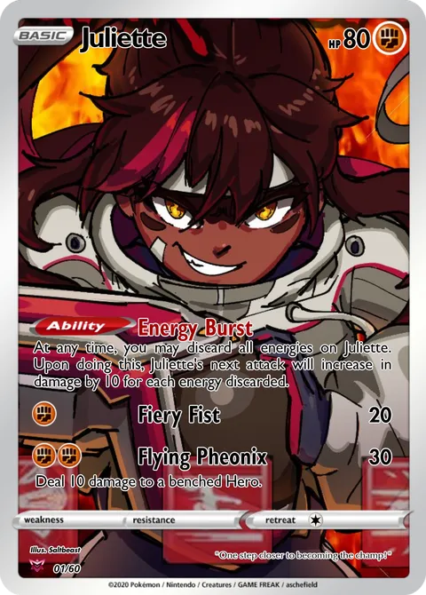 At any time, you may discard all energies on Juliette. Upon doing this, Juliette's next attack will increase in damage by 10 for each energy discarded.